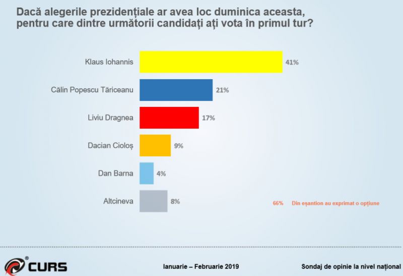 În ceea ce privește alegerile prezidențiale, intenția de vot este următoarea: Klaus Iohannis – 41%, Călin Popescu Tăriceanu – 21%, Liviu Dragnea – 17%, Dacian Cioloș – 9%, Dan Barna – 4%, altcineva – 8%.