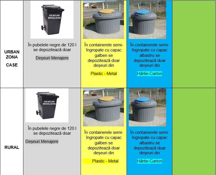 Containerele temporare se vor folosi pe  perioada în care se vor igieniza și înlocui sacii containerelor semi-îngropate cu capac gri, destinate deșeurilor menajere. În acest timp, depozitatrea deșeurilor menajere se va face în containerele negre temporare. În containerele semi-îngropate cu capac gri, din motive tehnice, este interzisă depozitarea.