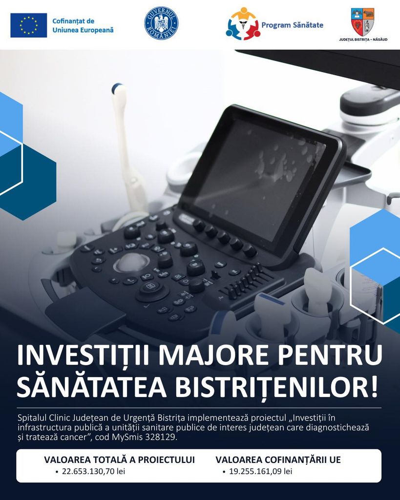 Spitalul Clinic Județean de Urgență Bistrița achiziționează 19 tipuri de echipamente medicale, în total 179 de bucăți, destinate secțiilor care diagnostichează și tratează afecțiunile oncologice.