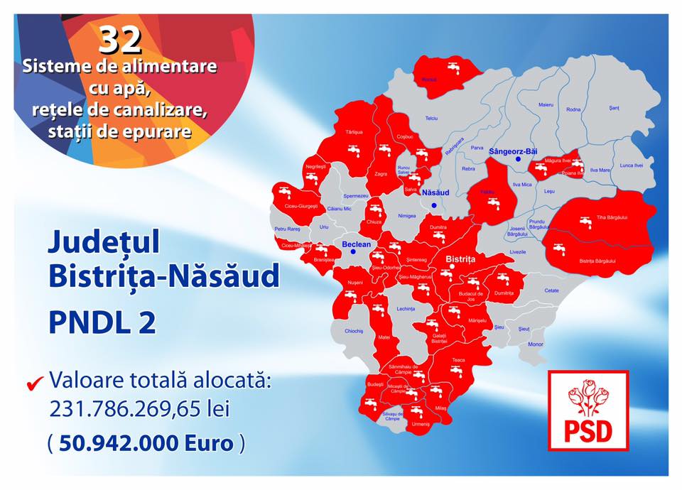 Prin Programul Național de Dezvoltare Locală – etapa 2, în perioada 2017-2020 se vor realiza în județul Bistrița-Năsăud 32 de sisteme de alimentare cu apă, rețele de canalizare și stații de epurare. Pentru aceste investiții sunt alocați peste 50 de milioane de euro, informează Consiliul Județean.