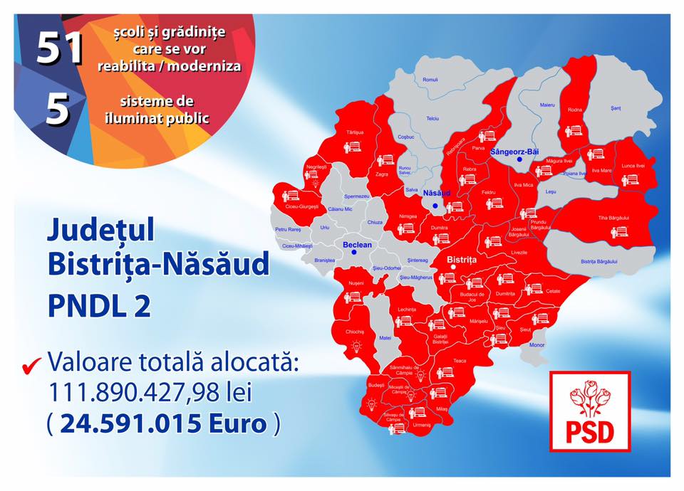 Judeţul Bistriţa-Năsăud primeşte 701.206.562,21 lei în total de la Ministerul Dezvoltării Regionale, Administraţiei Publice şi Fondurilor Europene (MDRAPFE) în cea de-a doua etapă a Programului Naţional de Dezvoltare Locală (PNDL), 2017-2020, pentru 168 de proiecte. Detalii aici.
