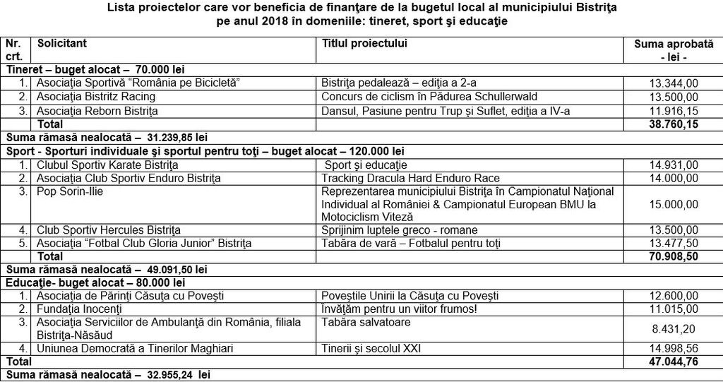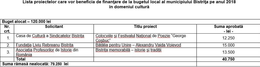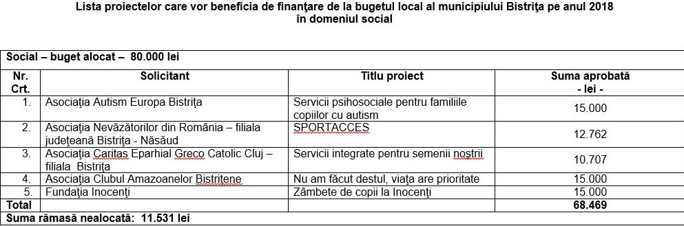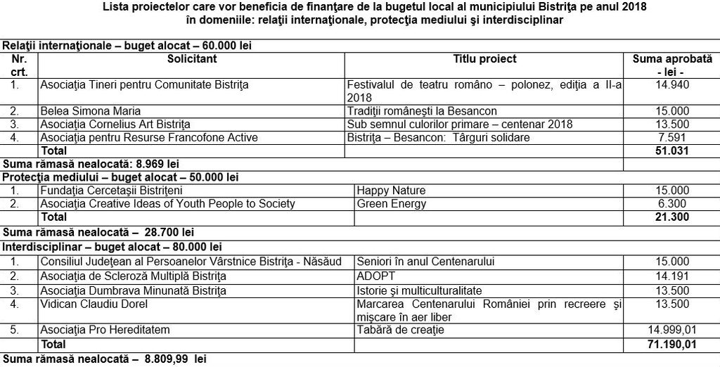 În sesiunea de depunere a proiectelor cu finanțare nerambursabilă de la bugetul local al Bistriței, în baza Legii 350/2005, organizată în perioada 20 februarie – 12 martie, au fost depuse 41 de proiecte ale persoanelor fizice, asociaţiilor, fundaţiilor şi cultelor religioase. Proiectele au fost evaluate de către comisiile Consiliului Local, fiind propuse spre finanţare 31 de proiecte în valoare totală de 409.453,42 lei.