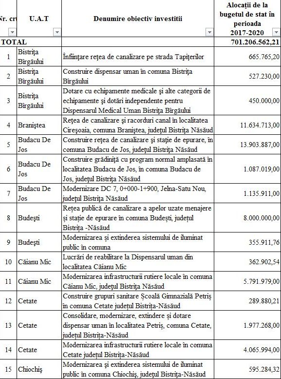 O veste foarte bună pentru județul nostru vine astăzi de la Guvernul României, în urma aprobării a 168 de lucrări de investiții prin Programul Național de Dezvoltare Locală! Cu un buget de 701.206.562,21 lei pentru perioada 2017-2020, acest program va aduce investiții în toate localitățile județului nostru care au depus proiecte eligibile, indiferent de culoarea lor politică! Mulțumesc Guvernului României în numele meu, al primarilor județului Bistrița-Năsăud și al tuturor locuitorilor județului nostru pentru operativitatea cu care a procesat proiectele trimise de administrațiile județului nostru. La fel cum am demonstrat încă din 2012, politica noastră sunt faptele și noi continuăm să dezvoltăm județul – președintele Consiliului Județean Bistrița-Năsăud, Radu Moldovan