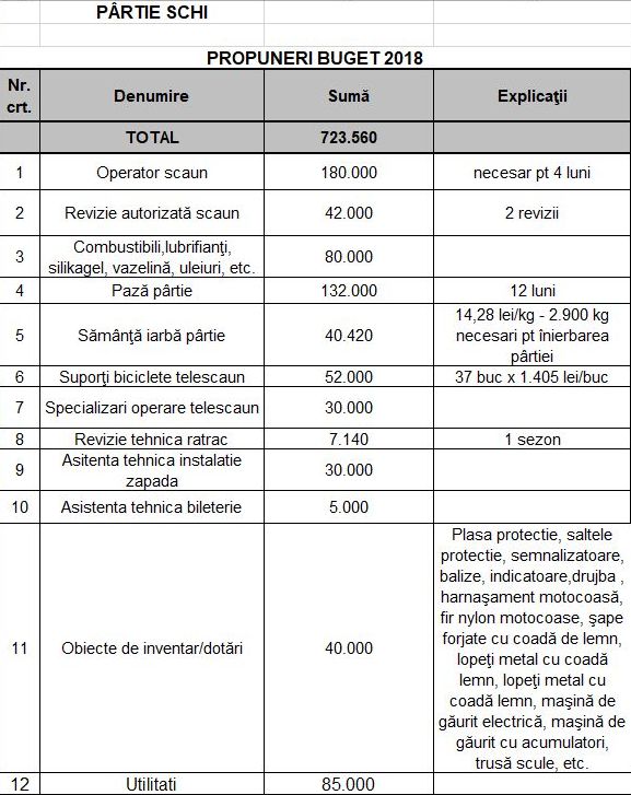 Cu 300.000 de lei va fi montat un teleschi pe 300 m de la baza pârtiei, iar 718.000 lei va costa construirea unui șopron pentru adăpostirea utilajelor și echipamentelor și a unor grupuri sanitare (în regie proprie, prin DSP).