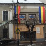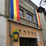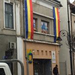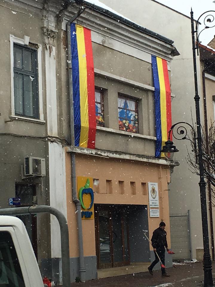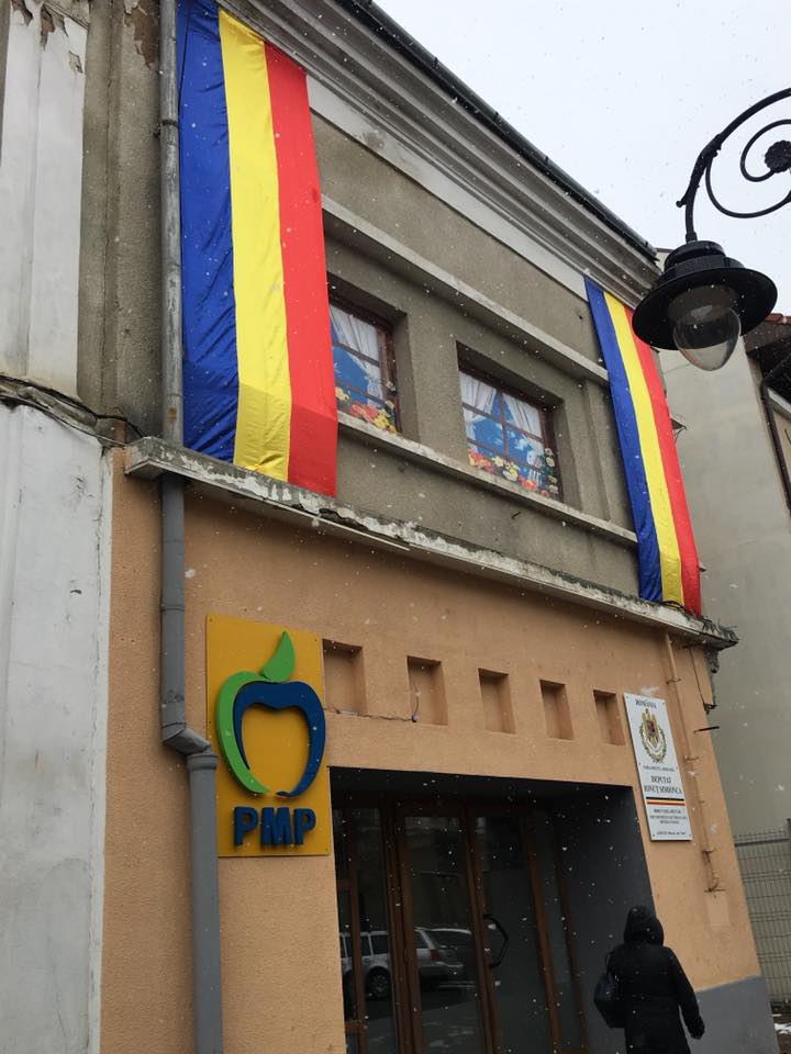 Două drapele tricolore au fost puse pe clădirea în care se află sediul PMP, pe str. Gheorghe Șincai din Bistrița.