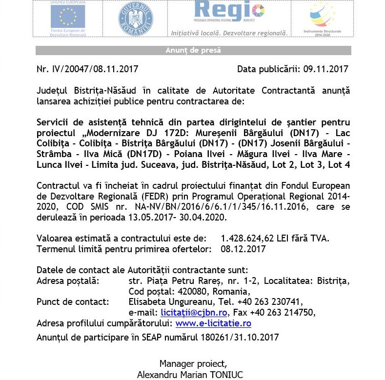 ANUNȚ Județul Bistrița-Năsăud, în calitate de Autoritate Contractantă, anunță lansarea achiziției publice pentru contractarea de: Servicii de asistență tehnică din partea dirigintelui de şantier pentru proiectul „Modernizare DJ 172D: Mureşenii Bârgăului (DN17) – Lac Colibiţa – Colibiţa – Bistriţa Bârgăului (DN17) – (DN17) Josenii Bârgăului – Strâmba – Ilva Mică (DN17D) – Poiana Ilvei – Măgura Ilvei – Ilva Mare – Lunca Ilvei – Limita jud. Suceava, jud. Bistriţa-Năsăud, Lot 2, Lot 3, Lot 4