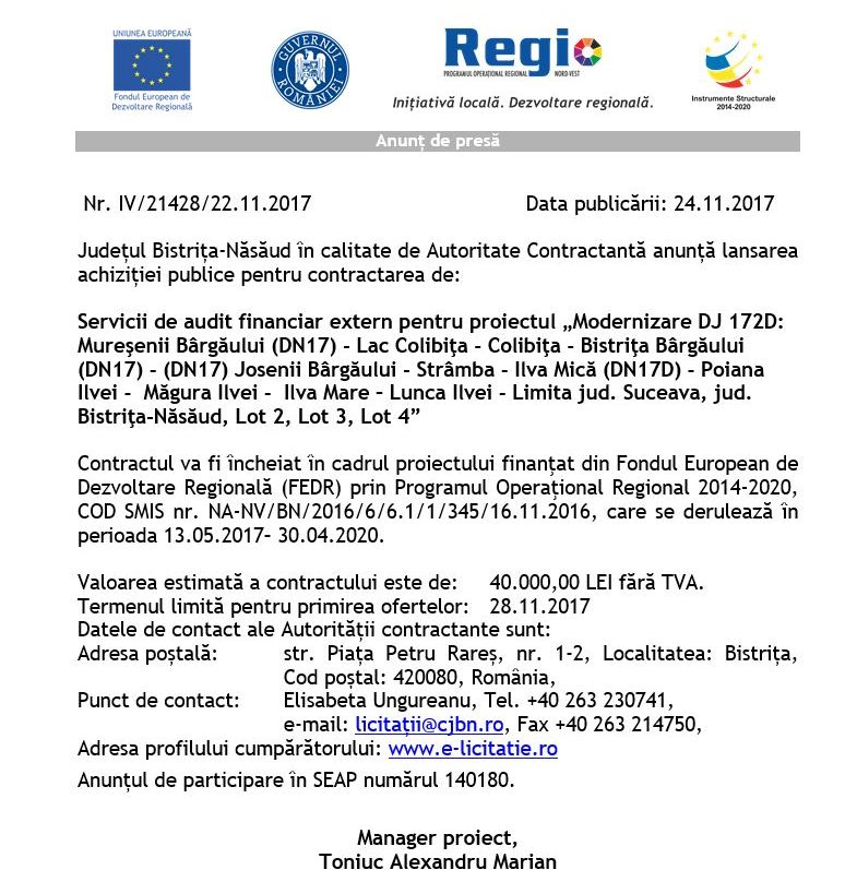 ANUNȚ Județul Bistrița-Năsăud în calitate de Autoritate Contractantă anunță lansarea achiziției publice pentru contractarea de: Servicii de audit financiar extern pentru proiectul „Modernizare DJ 172D: Mureşenii Bârgăului (DN17) – Lac Colibiţa – Colibiţa – Bistriţa Bârgăului (DN17) – (DN17) Josenii Bârgăului – Strâmba – Ilva Mică (DN17D) – Poiana Ilvei – Măgura Ilvei – Ilva Mare – Lunca Ilvei – Limita jud. Suceava, jud. Bistriţa-Năsăud, Lot 2, Lot 3, Lot 4”: