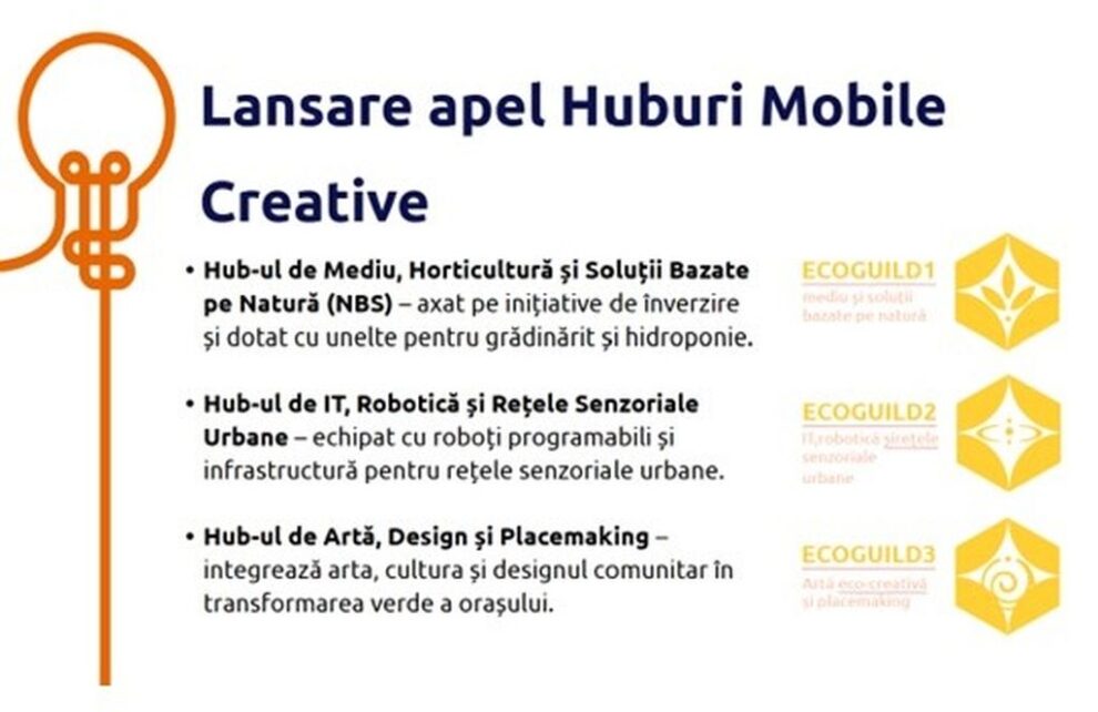 Sub sloganul „Adu un Hub Mobil Creativ în școala ta!” invităm școlile și profesorii să se înscrie în programul Huburile Mobile Creative – EcoGuilds, o inițiativă care aduce trei platforme educaționale mobile în curtea școlilor și în spațiile comunității. Fiecare hub are o tematică proprie – mediu și horticultură, IT și robotică, artă și design – și este dotat cu echipamente moderne și activități practice care stimulează creativitatea, colaborarea și învățarea interactivă.