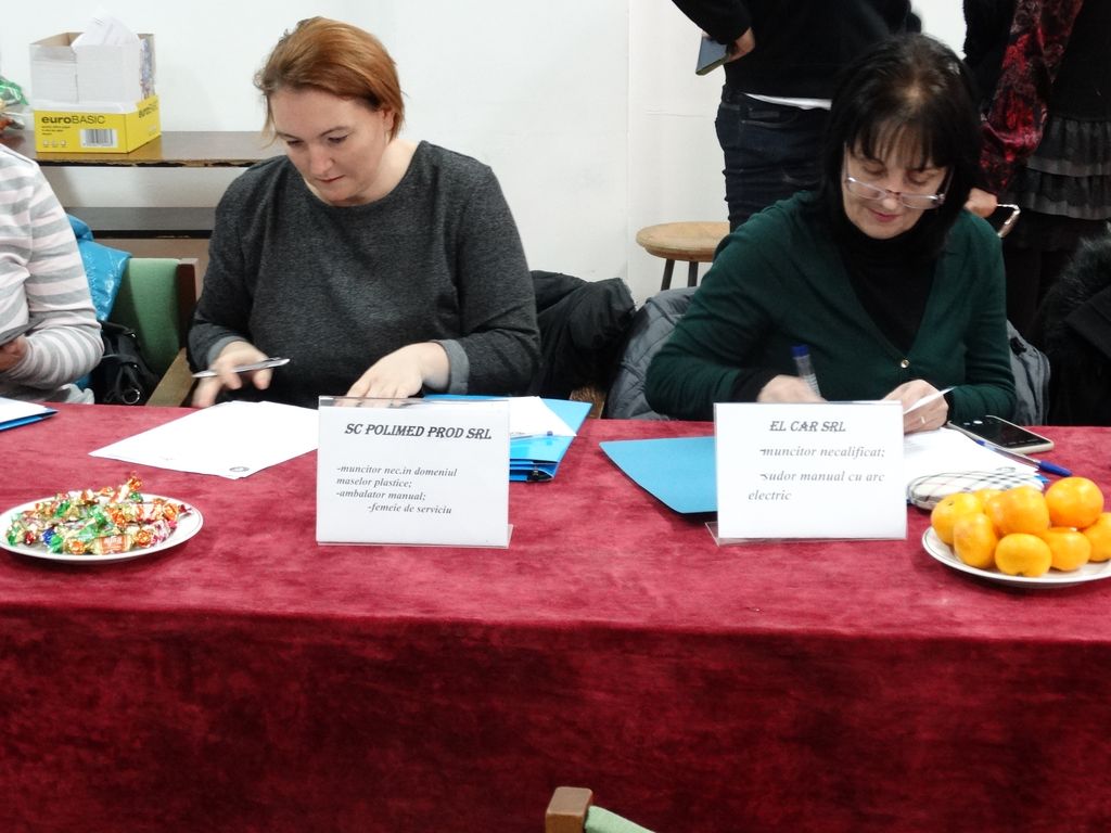 Au fost prezenţi 9 agenţi economici care au oferit 21 locuri de muncă vacante în următoarele meserii: operator maşini-unelte, sudor, lăcătuş mecanic, confecţioner tâmplarie, gestionar depozit, operator prelucrare mase plastice, reglor la maşini prelucrare mase plastice, stivuitorist, electrician, muncitor produse panificaţie, ambalator manual, muncitor necalificat, etc.