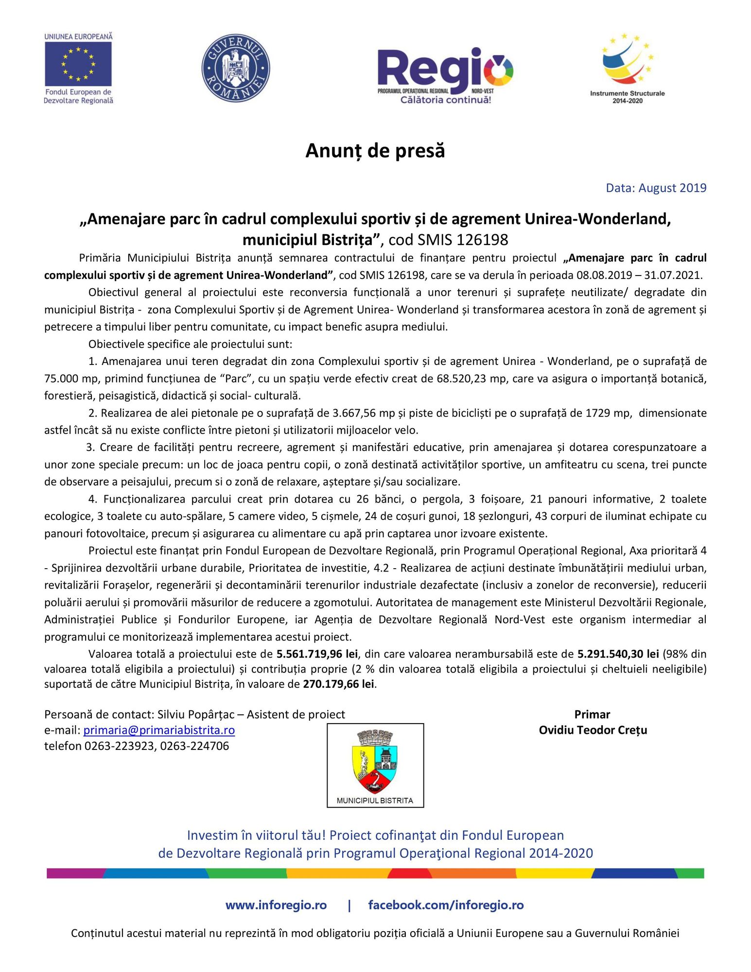 Primăria municipiului Bistrița anunță semnarea contractului de finanțare pentru proiectul ”Amenajare parc în cadrul complexului sportiv și de agrement Unirea-Wonderland, municipiul Bistrița”, care se derulează în perioada 08.08.2019 – 31.07.2021.