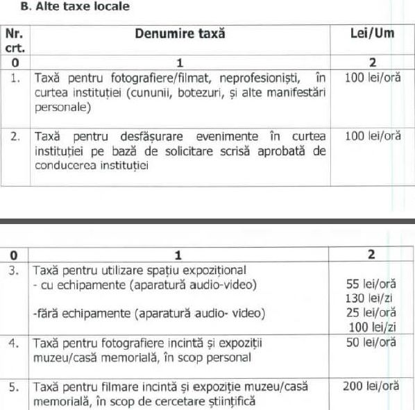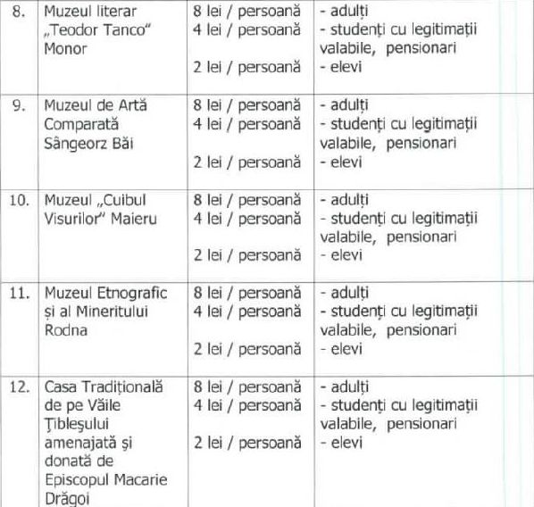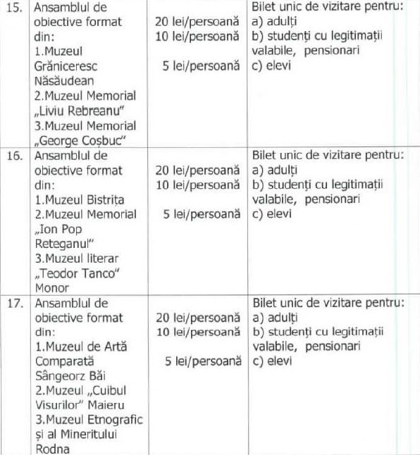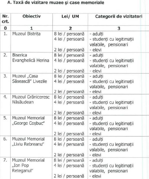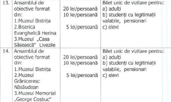 Pentru vizitarea pe parcursul unei zile a mai multor muzee și case memoriale din cadrul Complexului Muzeal Bistrița-Năsăud, taxa va fi majorată de la 15 lei la 20 de lei pentru adulți și de la 8 lei la 10 lei pentru studenți și pensionari. Pentru elevi, se va reduce de la 8 lei la 5 lei.