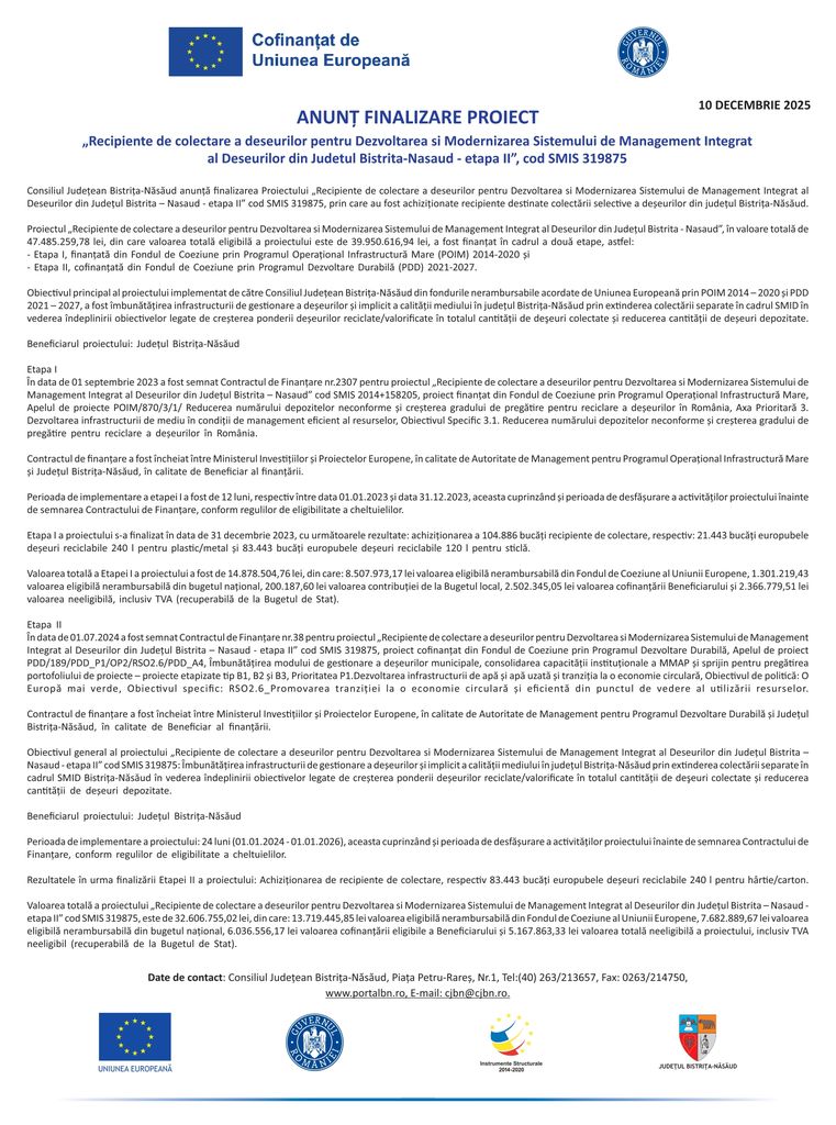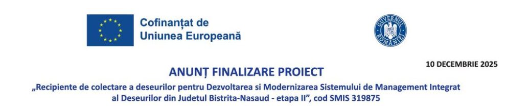 Consiliul Județean Bistrița-Năsăud anunță finalizarea proiectului ”Recipiente de colectare a deșeurilor pentru Dezvoltarea și Modernizarea Sistemului de Management Integrat al Deșeurilor din Județul Bistrița-Năsăud – etapa II”.