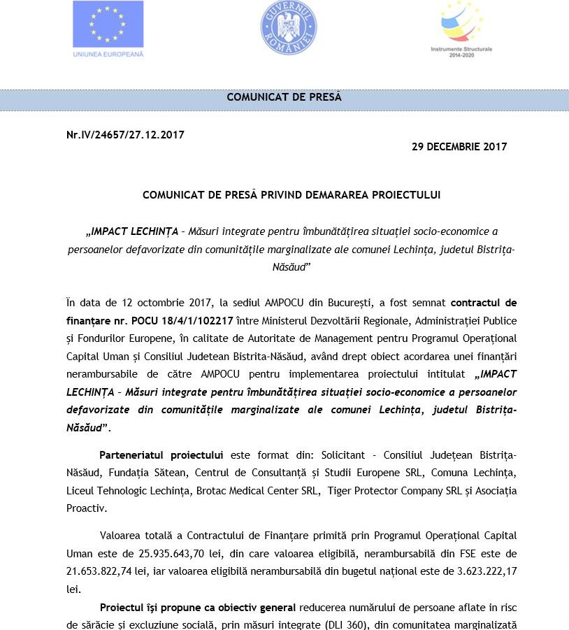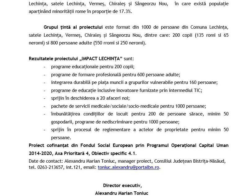 COMUNICAT DE PRESĂ privind demararea proiectului ”Impact Lechința – Măsuri integrate pentru îmbunătățirea situației socio-economice a persoanelor defavorizate din comunitățile marginalizate ale comunei Lechința, judetul Bistrița-Năsăud”