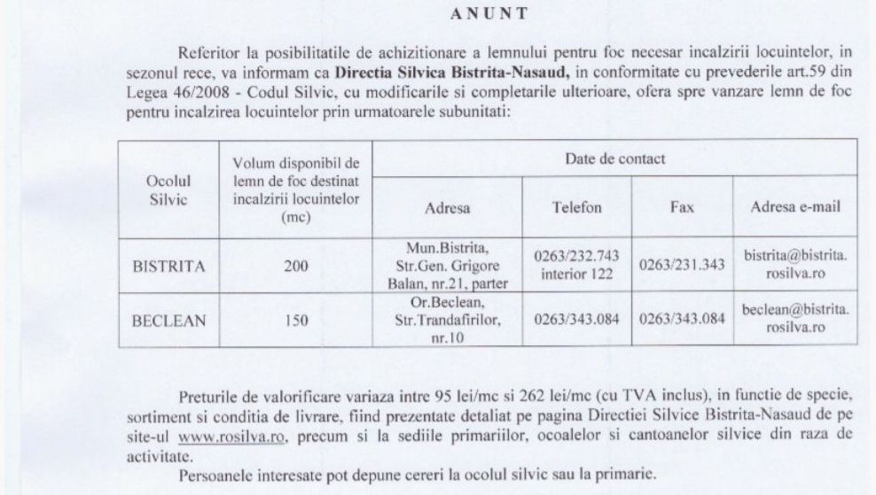 Toate volumele și prețurile de vânzare a lemnului destinat încălzirii locuințelor sunt disponibile la sediile celor 313 ocoale silvice din cadrul Romsilva, dar și centralizat pe pagina de internet a Romsilva, www.rosilva.ro, la secțiunea ”Lemn pentru foc – de vânzare”, datele la nivelul direcțiilor silvice fiind permanent actualizate.