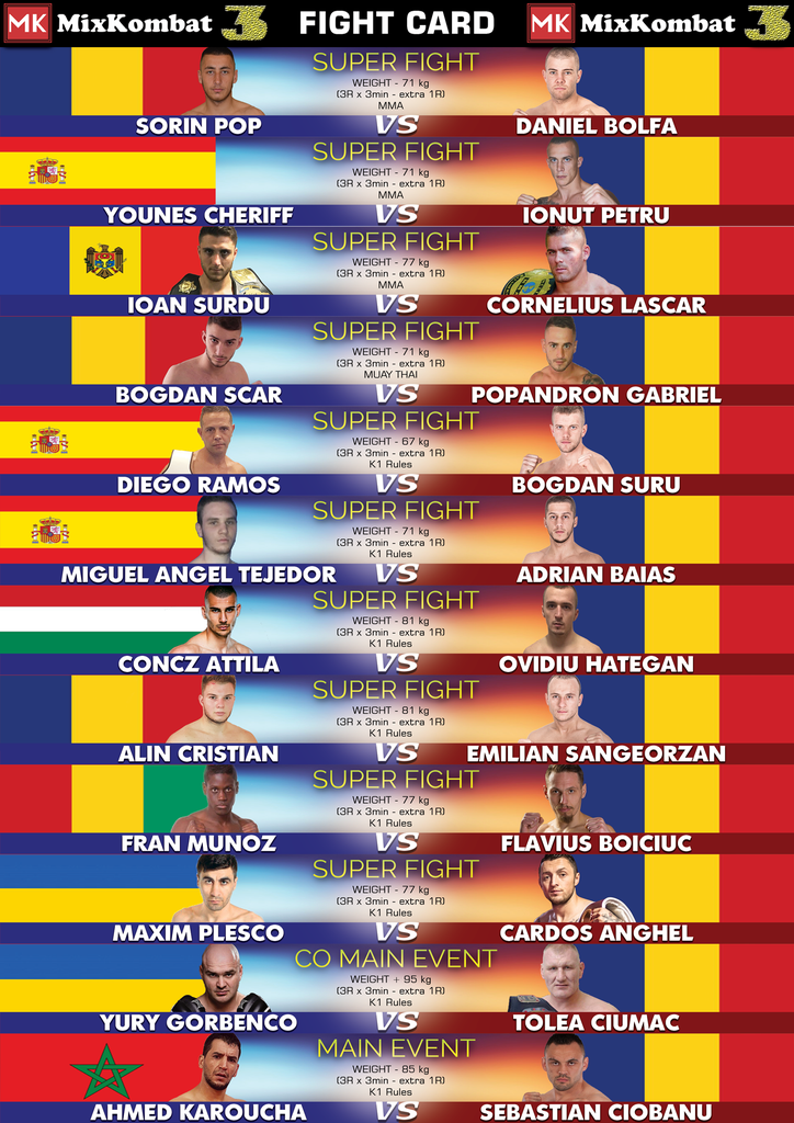 Asociația Clubul Sportiv Profesional Fight Gym organizează în colaborare cu Consiliul Județean Bistrița-Năsăud a treia ediție a Galei Mix Kombat. Evenimentul reunește 28 luptători din țară și străinătate, care vor concura pentru premiile puse în joc la stilurile K1, MMA si Muay Thai. Mix Kombat 3 are loc sâmbătă 14 octombrie, la Sala Polivalentă din Bistrița, de la ora 18.00.