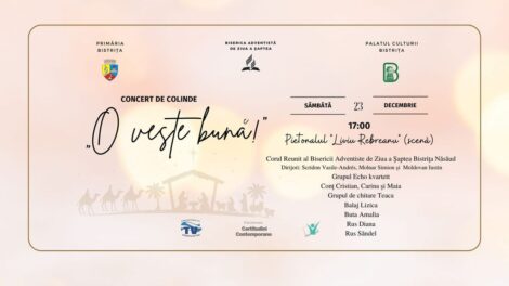 Biserica Adventistă de Ziua a Șaptea vă invită la Concertul de colinde “O veste bună” care va avea loc în 23 decembrie 2023, începând cu...