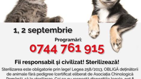 O nouă rundă de sterilizări gratuite pentru câini și pisici de rasă comună, cu sau fără stăpân, va avea loc în zilele de 1 și 2 septembrie la Sigmir...