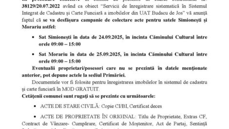 În vederea realizării cadastrului general în comuna Budacu de Jos și a înregistrării sistematice în Sistemul integrat de cadastru și carte funciară...