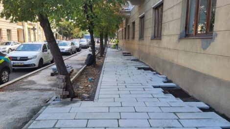 Continuă lucrările de montare de pavaj din piatră naturală pe trotuare, în cadrul proiectului Linia Verde, acum în centrul istoric al Bistriței, pe...