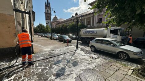 În centrul Bistriței se fac lucrări de curățare și dezinfecție. Pasajele, străduțele, aleile și piețele, carosabilul și trotuarele, sunt spălate...