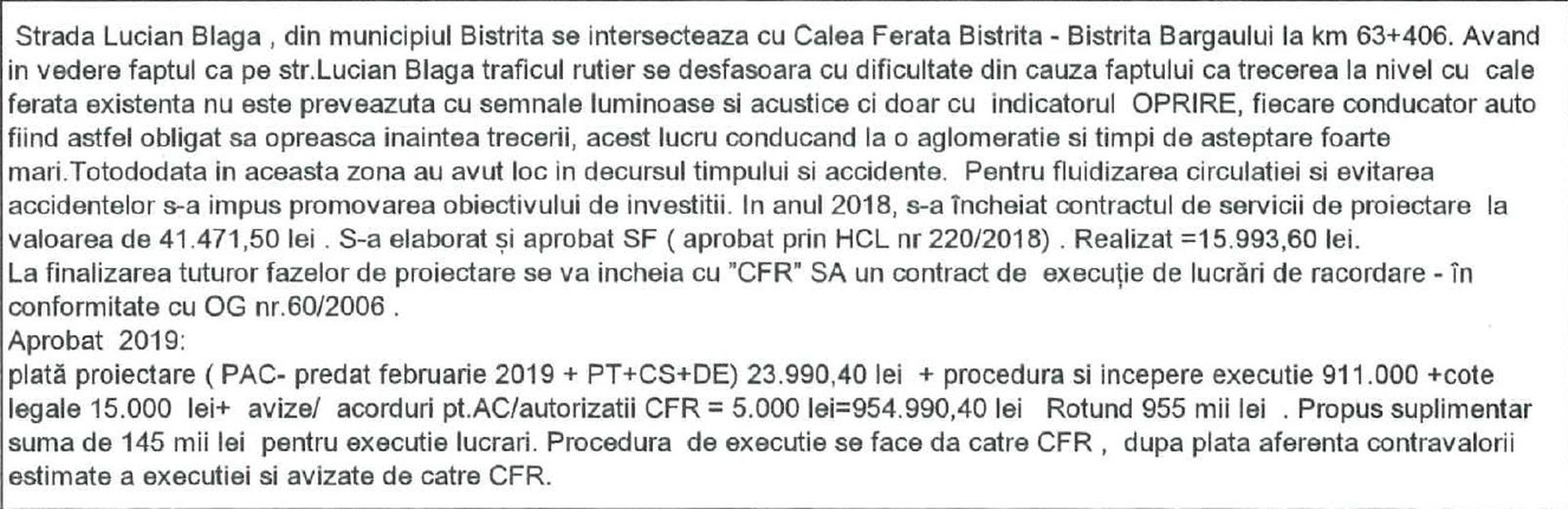 În vederea modernizării trecerii CF de pe str. Lucian Blaga cu instalație de semnale luminoase și acustice, suma alocată la începutul anului (955.000 lei) va fi suplimentată cu 145.000 de lei pentru execuția lucrărilor.
