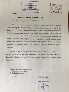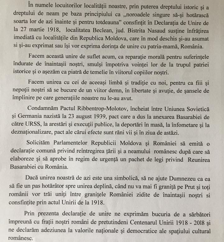 Astăzi, în ședința Consiliului Local al orașului Beclean s-a adoptat cu unanimitate de voturi ”Declaraţia de Unire cu Republica Moldova”.