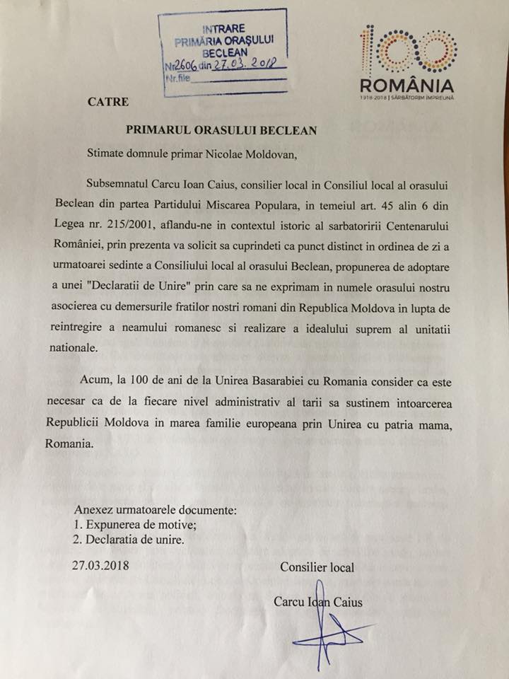 Proiectul a fost depus de către prim-vicepreședintele PMP Bistrița-Năsăud, Caius Cârcu, consilier local al orașului Beclean. ”Au trebuit să treacă 100 de ani pentru ca cetățenii și clasa politică a României și Republicii Moldova să înțeleagă că este momentul să redevină o singură țară. 100 de ani ne-au trebuit nouă, românilor de pe ambele maluri ale Prutului, să înțelegem că stă în puterea noastră să cerem reîntregirea țării și că uniți ne putem face auzită vocea. În contextul geopolitic de azi, aniversarea Unirii Basarabiei cu România, moment care a marcat începutul unui an 1918 memorabil, pentru națiunea română, are o încărcătură aparte. Însă, spre deosebire de Transilvania, Basarabia este încă ruptă din trupul țării. Acum, la 100 de ani de la Unirea Basarabiei cu România, consider că este necesar ca de la fiecare nivel administrativ al țării să susținem cu toată convingerea întoarcerea Republicii Moldova în marea familie europeană prin unirea cu patria mamă, România. Republica Moldova, te așteptăm acasă!”, a menționat Caius Cârcu, potrivit unui comunicat de presă.