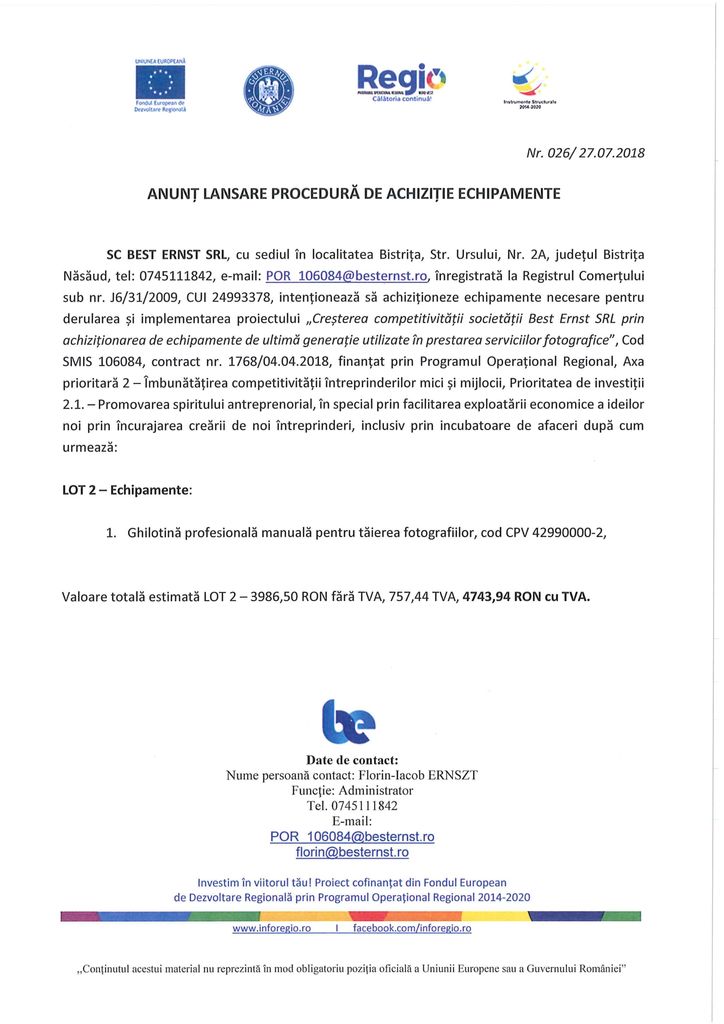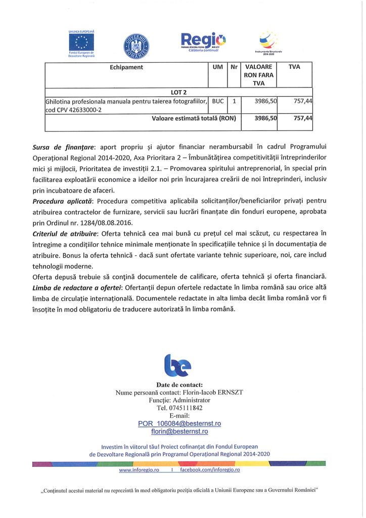 SC Best Ernst SRL Bistrița intenționează să achiziționeze echipamente necesare pentru derularea și implementarea proiectului ”Creșterea competitivității societății Best Ernst SRL prin achiziționarea de echipamente de ultimă generație utilizate în prestarea serviciilor fotografice”, finanțat prin Programul Operațional Regional.