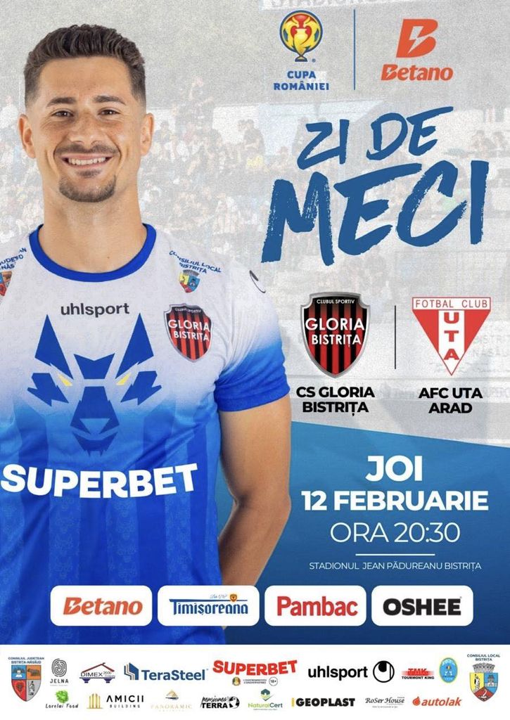 Gloria Bistrița joacă în nocturnă pe Stadionul ”Jean Pădureanu” ultimul meci din Grupa B a Cupei României la fotbal, cu UTA Arad, joi 12 februarie de la ora 20.30.