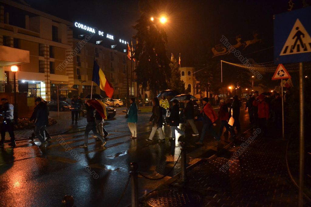 În faţa statuii lui Andrei Mureşanu, grupul de manifestanţi s-a oprit, a fluturat drapele şi a ascultat imnul naţional, apoi s-au întors la Prefectură tot în marş.