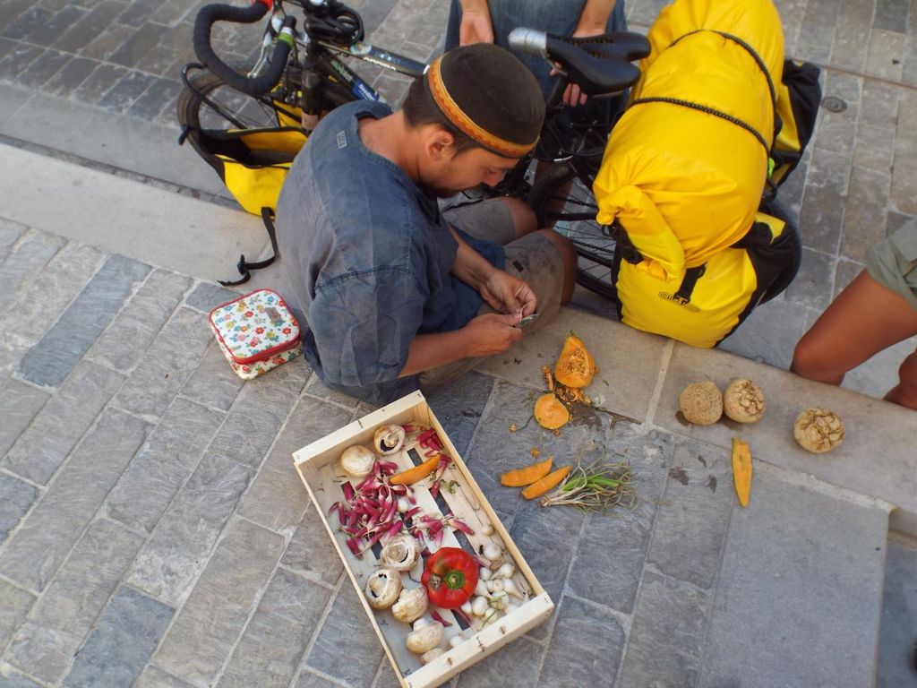 În ce priveşte mâncarea, Victor scrie că găseşte suficientă în tomberoane. “Prima dată când am mâncat de la pubela unui supermaket a fost acum patru ani în Cipru. Mă aflăm într-o comunitate hipi-anarhistă și mă uitam cu uimire de copil în frigiderul lor. Era plin ochi de iaurt, brânzeturi, fructe, ciocolată, bere, prăjitură… Cu cei din comunitate am avut și primul botez într-o pubelă din Paphos (orașul de unde recuperam mâncare). N-am să uit seara aceea prea curând, frigiderul l-am umplut atunci cu o sută de iaurturi de oaie. Mi-a fost greu să vorbesc deschis despre cum recupez mâncare din tomberoanele magazinelor. A fost o reținere și pentru mult timp am ținut secret. Când eram mic îmi era interzis să mănânc de pe jos. Atunci știam ce-i caca și mă țineam departe de orice felie de pizza căzută de pe masă. Acum duc o viață decadentă. În fiecare oraș când ajung vizitez catedrală, tomberoanele și casele ocupate abuziv”, a mai menţionat el.