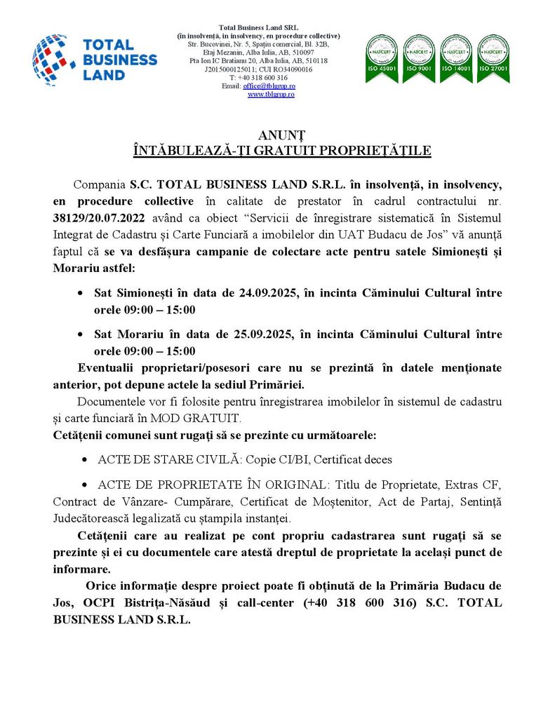 În vederea realizării cadastrului general în comuna Budacu de Jos și a înregistrării sistematice în Sistemul integrat de cadastru și carte funciară, se va desfășura o campanie de colectare de acte, anunță primarul Florin Sandu Simionca.