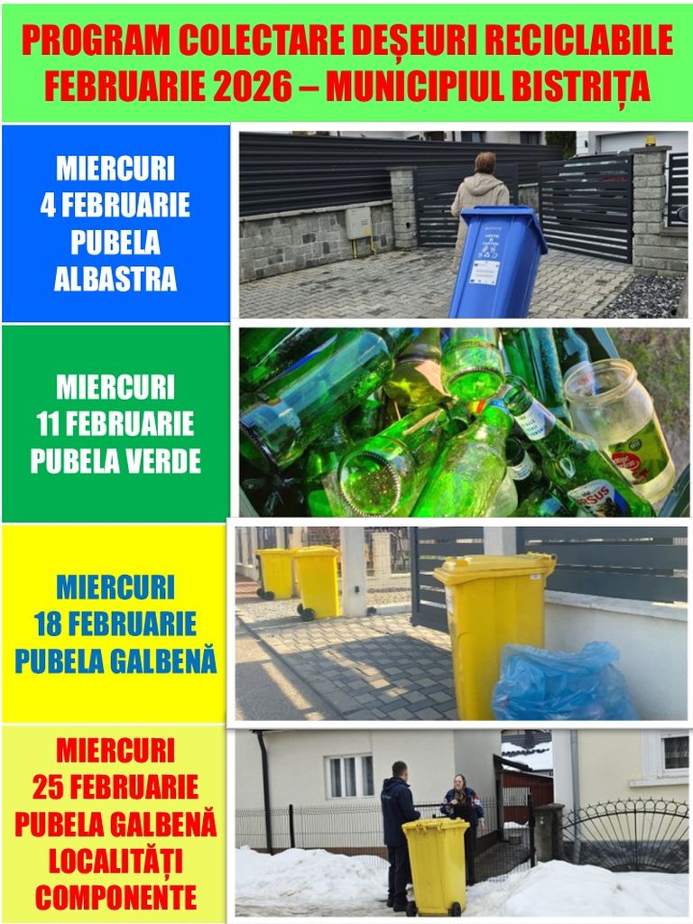 Iată programul de colectare a deșeurilor reciclabile în luna februarie 2026 pentru municipiul Bistrița și localitățile componente.