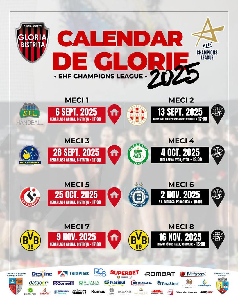 Echipa de handbal feminin Gloria Bistrița va debuta în 6 septembrie în noul sezon al Ligii Campionilor, acasă cu Storhamar din Norvegia.