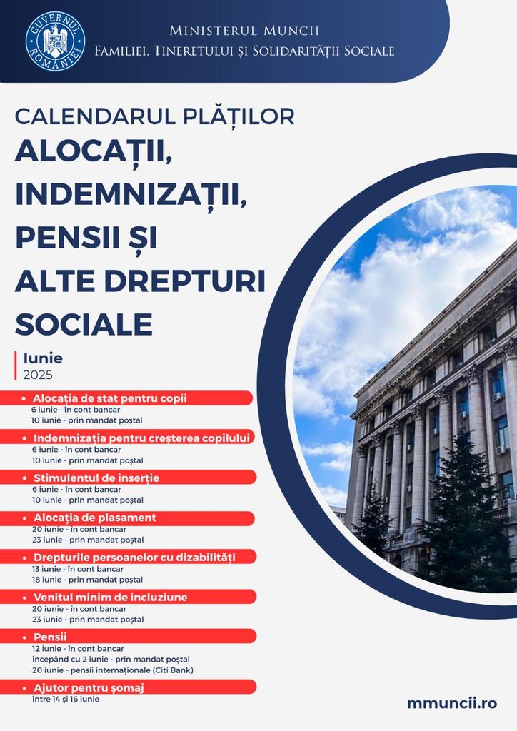 - ajutorul pentru susținerea familiei (VMI): 20 iunie în cont bancar; începând cu 23 iunie prin mandat poștal