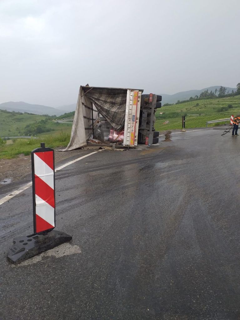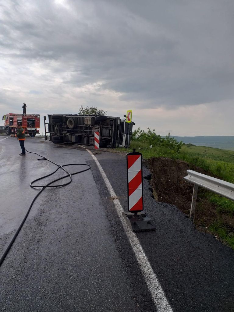 Un camion s-a răsturnat pe DN 15 A în afara părții carosabile, în zona localității Teaca, la locul accidentului fiind direcționate un echipaj de pompieri și unul medical.