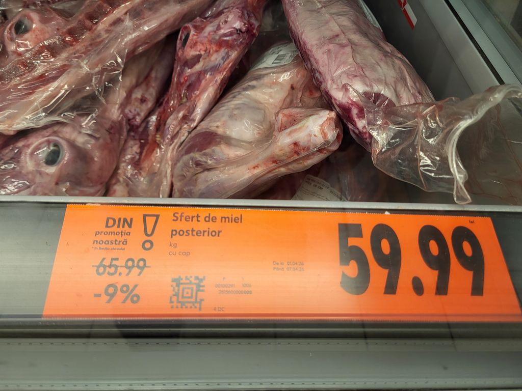 În Kaufland, un kg de sfert de miel posterior costa, duminică, 59,99 lei, redus cu 9%, prețul inițial fiind de 65,9 lei/kg.
