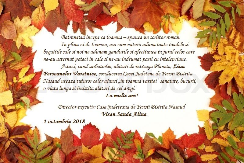 De Ziua Internațională a Persoanelor Vârstnice, conducerea Casei Județene de Pensii Bistrița-Năsăud le urează tuturor celor ajunși ”în toamna vârstei” sănătate, bucurii, o viață lungă și liniștită alături de cei dragi: