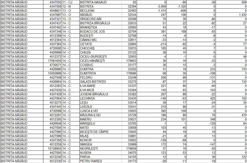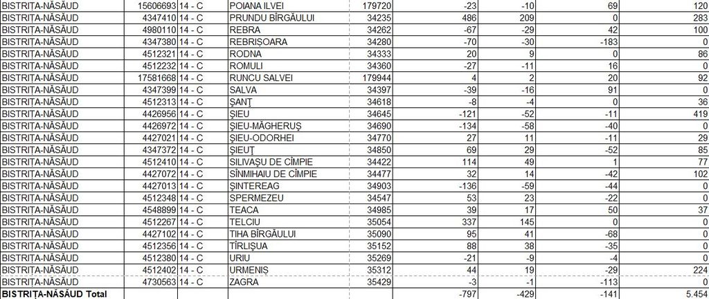 Repartizarea pe UAT-uri (Consiliul Județean – 509.000 lei care vor fi ulterior repartizați, orașe – doar Năsăud primește bani, comune în ordinea alfabetică):