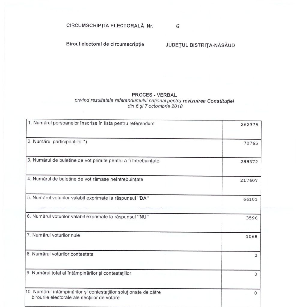 Dintre participanţii, 3.596 au votat “NU”, iar 1.068 de voturi au fost declarate nule, anunţă Biroul Electoral Judeţean Bistriţa-Năsăud.