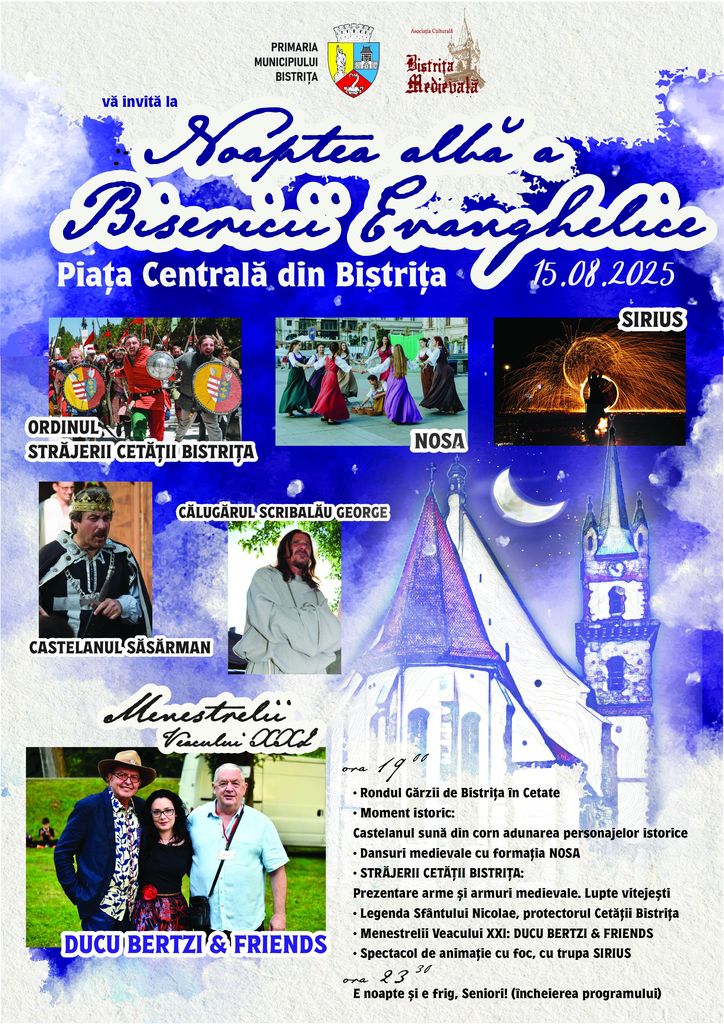 Este ziua Nopții Albe a Bisericii Evanghelice! Vineri 15 august, o seară magică în Piața Centrală a Cetății Bistrița, unde tradiționalul eveniment cultural Noaptea Albă a Bisericii Evanghelice propune un program mai complex ca oricând: animație medievală cu cavaleri și domnițe, animație cu foc, muzică.