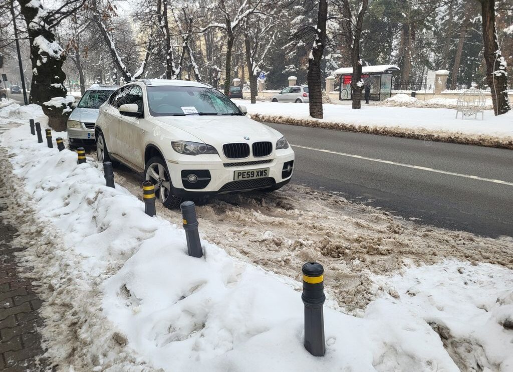Mașina marca BMW, înmatriculată în străinătate, a fost parcată în mijlocul unei alveole de pe Bulevardul Republicii, așa încât ocupă două locuri de parcare.