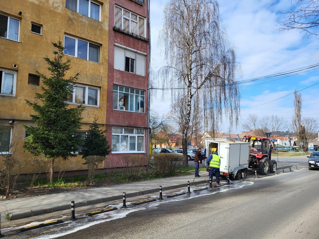 Un tractor al Direcției de Infrastructură și Servicii, cu un rezervor cu apă, a putut fi observat, vineri, pe strada Ioan Slavici. Un muncitor, cu un furtun, curăța fiecare stâlp în parte cu apă și detergent.