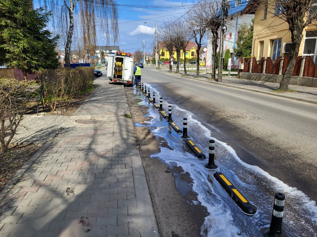 Stâlpii care delimitează pistele pentru cicliști creează adevărate depozite de praf în oraș întrucât nu pot fi curățate mecanizat. Primăria Bistrița a găsit însă o soluție pentru ca să curețe și această parte din carosabil: spălarea manuală a stâlpilor cu jet.