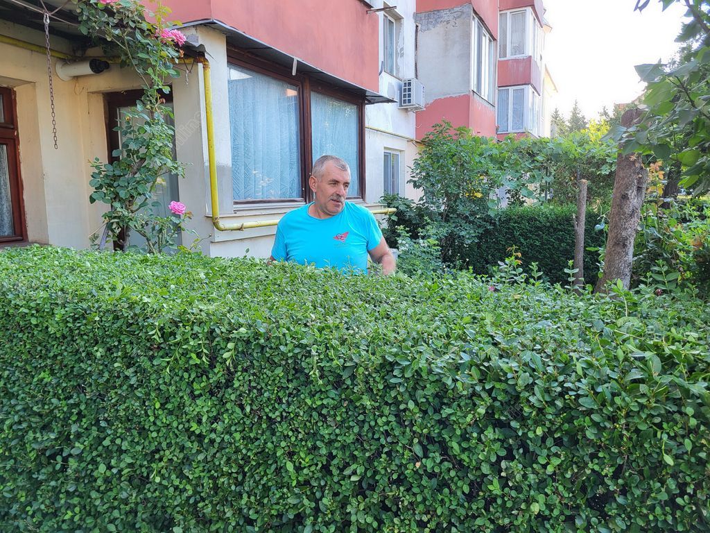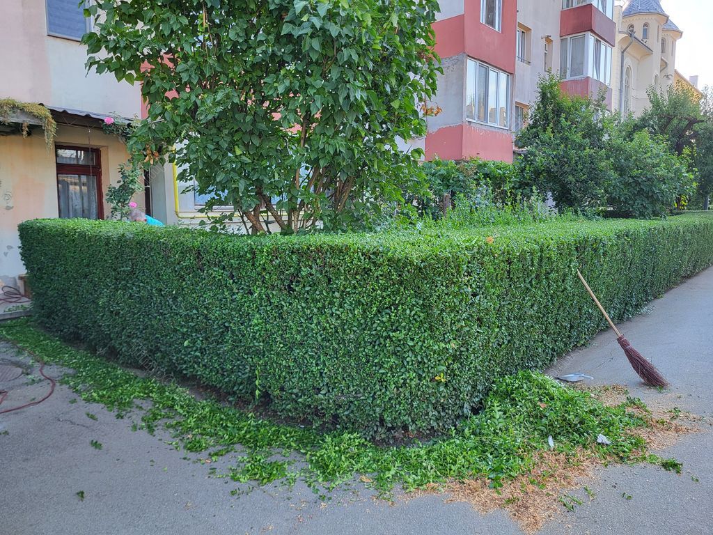 Bărbatul, care locuiește într-una dintre scările blocului de pe strada Arțarilor nr. 40, a curățat gardul viu de la ambele scări cu ajutorul unui utilaj, iar trei doamne au ieșit să măture resturile vegetale care au căzut pe trotuar.