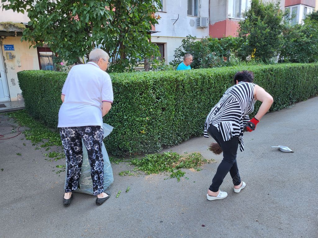 Locatarii unui bloc situat pe strada Arțarilor, lângă Piața Decebal, se ocupă ei înșiși de întreținerea gardurilor vii care le protejează locuințele de mizerie și praf. Un bărbat tăia, luni, crengile care au crescut, iar două doamne măturau frunzele.