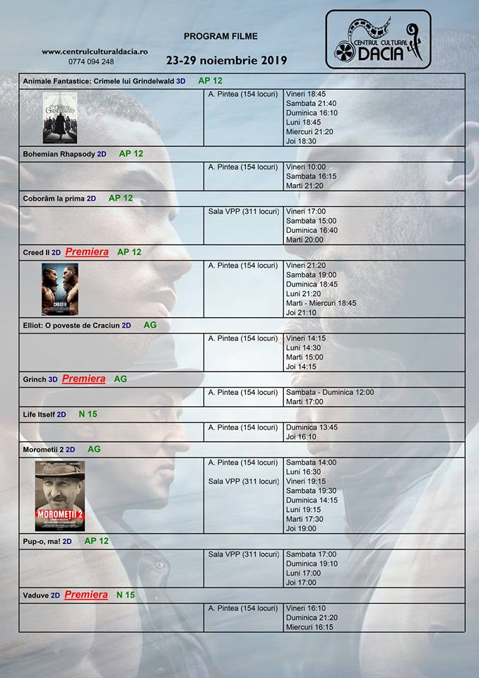 ”Un nou capitol se scrie săptămâna aceasta la Centrul Cultural Dacia. Dăm start proiecțiilor de filme în sala ”Valeria Peter Predescu”. Un proiect inițiat cu mai bine de un an și jumătate ajunge săptămâna aceasta să prindă viață. Încă de la început, cinefilii din orașul nostru și-au dorit vizionarea de filme europene, românești, de artă sau biografice în cinematograful din Bistrița. Având în vedere că până acum am dispus de un singur ecran, acest fapt era aproape imposibil de realizat. De aici a prins viață ideea de a crea un spațiu și condițiile vizionării acestui gen de filme. Demarăm proiectul cum nu se poate mai bine – cu trei filme românești, filme care au umplut sălile de cinematograf în întreaga țară. Vă invităm în acest week-end să le vizionați în sala ”Valeria Peter Predescu”, anunță Centrul Cultural Dacia: