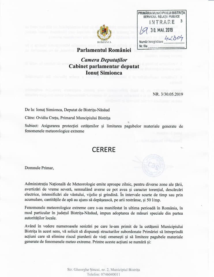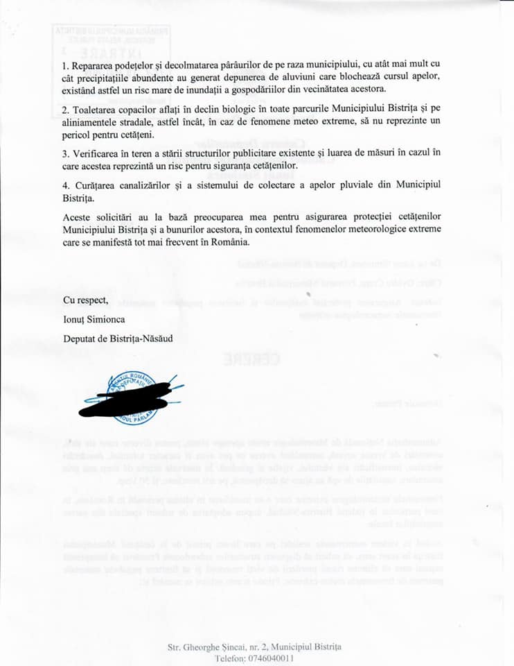 ”După ce mai mulți cetățeni mi-au semnalat că gospodăriile lor sunt inundate de câte ori plouă mai serios din cauza revărsării pârâului Slătinița, i-am cerut primarului Crețu să ia, de urgență, măsuri care să limiteze pagubele de acest gen, cum ar fi: repararea podețelor și decolmatarea pârâurilor de pe raza municipiului, curățarea canalizărilor și a sistemului de colectare a apelor pluviale, toaletarea copacilor aflați în declin biologic etc. Având în vedere fenomenele meteorologice extreme din ultima vreme, unde ar trebui să intervină Primăria Bistrița pentru a preîntâmpina distrugerea caselor și a terenurilor agricole de pe raza municipiului?”, a scris el.