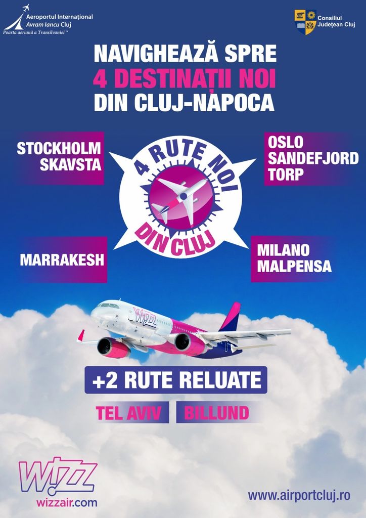 Iarna aceasta începe cu vești bune și cu aripi noi pentru pasagerii din Transilvania care visează la zăpezile nordului sau la culorile deșertului marocan. Aeroportul Internațional Avram Iancu Cluj, împreună cu Consiliul Județean Cluj și compania aeriană Wizz Air, anunță extinderea rețelei de zboruri prin introducerea a cinci noi rute internaționale spre Marrakesh (Maroc), Stockholm Skavsta (Suedia), Billund (Danemarca), Tel Aviv (Israel) și Oslo Sandefjord Torp (Norvegia).
