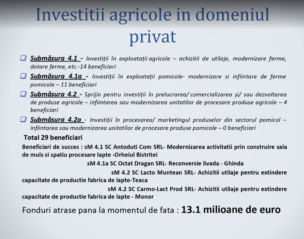 În achiziții de utilaje, modernizare de ferme, în exploatații pomicole și în unități de procesare s-au investit 13,1 milioane de euro.